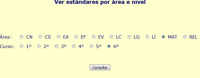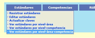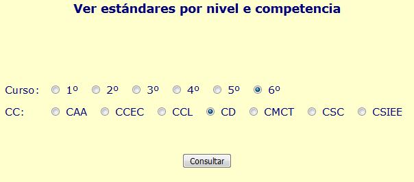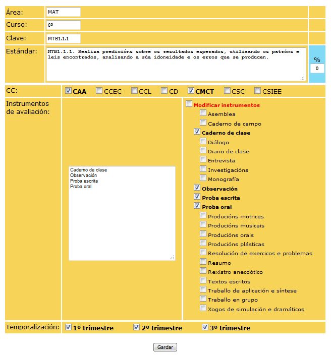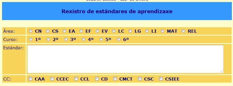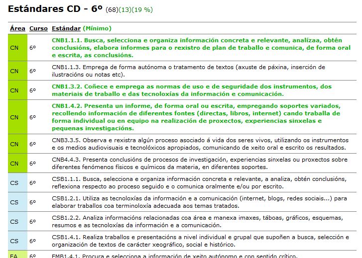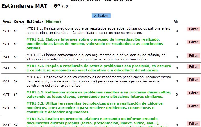 Cando seleccionamos estándares para editar ou para concretar mínimos, na cabeceira do formulario que lista os estándares dunha área e nivel aparecen:
