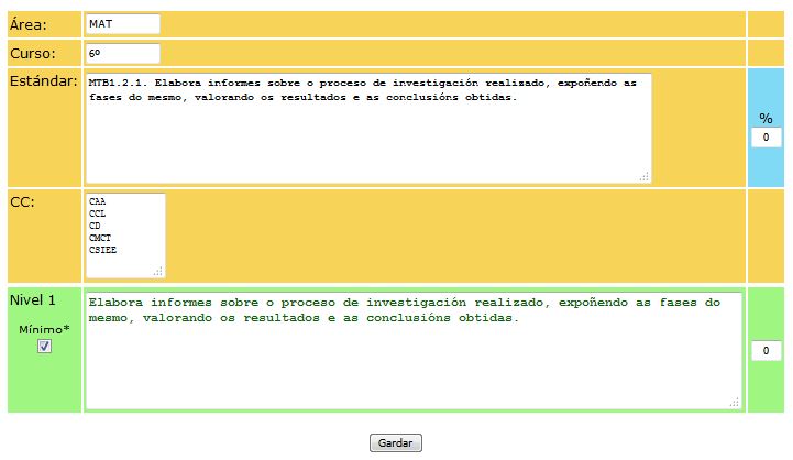 Se picamos no botón dun estándar que non ten concretado o mínimo aparécenos un formulario 0co texto do estándar, coas competencias clave asociadas a ese estándar e co texto do estándar sen clave.